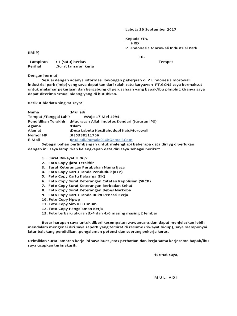 Inilah pembahasan lengkap terkait contoh surat lamaran kerja pt imip morowali.